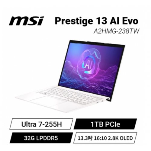 MSI 微星Prestige 13 AI Evo A2HMG-238TW(Ultra 7 255H/32G/1T SSD/13.3"2.8K/Win11Pro/白)商務筆電