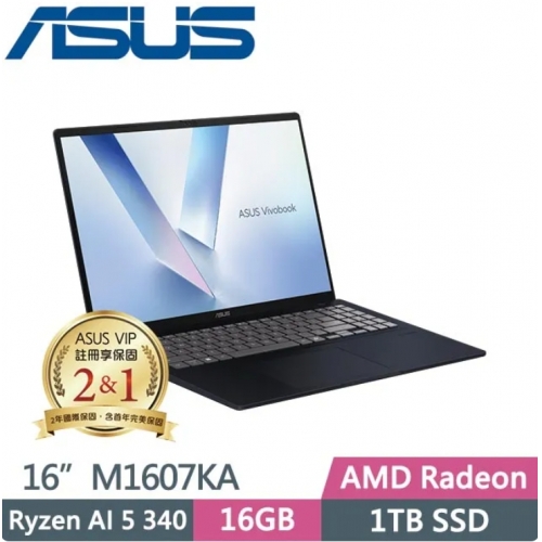 ASUS 華碩Vivobook 16 M1607KA-0031B340H 午夜藍 (Ryzen AI 5 340/16GB/1TB /Win11/16吋) 筆電