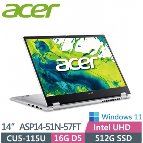 ACER 宏碁AspireSpin ASP14-51N-57FT 銀(CU5-115U/16G D5/512G/Win11/14吋)翻轉觸控筆電