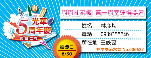 光華數位新天地4周年慶-周周抽平板第一周的幸運得獎主已誕生了,請這位幸運的朋友在7/10前趕快攜帶身分證件影本及抽獎券存根聯,到我們周年慶的承辦單位處領獎喔!(肯果行銷有限公司-新北市板橋區文化路一段266號21樓)