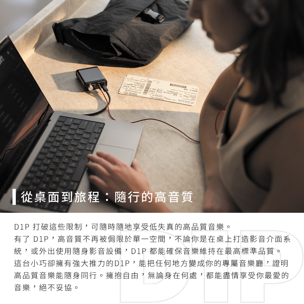 有了 D1P,高音質不再被侷限於單一空間,不論你是在桌上打造影音介面系統,或外出使用隨身影音設備,D1P都能確保音樂維持在最高標準品質。