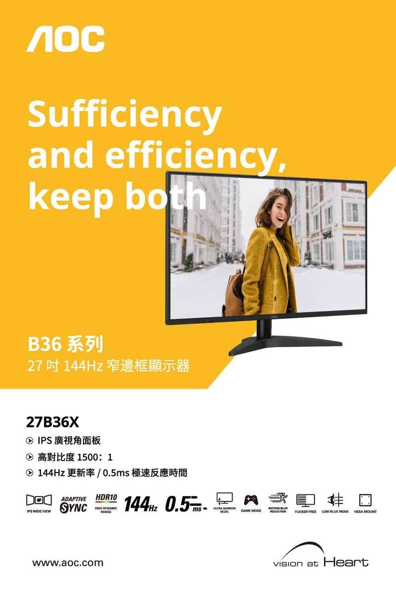AOC 27B36X 27型 IPS FHD 三邊極窄邊框螢幕(0.5ms/HDMI/VESA壁掛/抗藍零閃)/120725