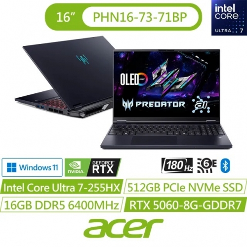 AI PN : NH.QVQTA.002 型號 : PHN16-73-71BP 作業系統 : Windows 11 Home 【CPU】 CPU : Intel☆ Core™ Ultra 7 processor 255HX clock/Turbo : 2.4 GHz/5.2 GHz Cores/Threads : 20/20 Smart Cache : 30 MB 晶片組 : HM870 【LCD】 尺寸/規格 : 16" 16:10/IPS/180Hz/霧面/LED背光 解析度 : WQXGA 2560 x 1600 色域 : sRGB 100% 亮度 : 400 nits