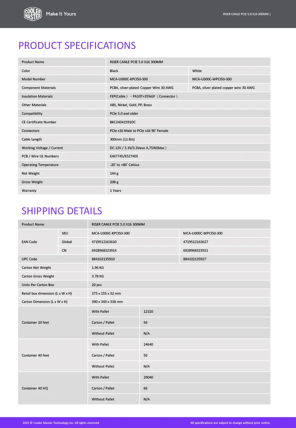 ✅產品型號:MASTERACCESSORY MCA-U000C-KPCI50-200|200MM 黑色 MCA-U000C-WPCI50-200|200MM 白色 MCA-U000C-KPCI50-300|300MM 黑色 MCA-U000C-WPCI50-300|300MM 黑色 ✅產品保固:兩年保固 ✅產品特色 PCIe 5.0 高度相容 超耐用 PCB 設計 超柔軟線材,安裝更便利 ✅產品規格