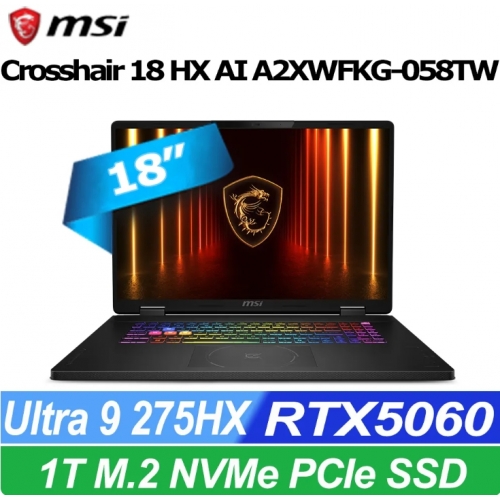 MSI 微星Crosshair 18 HX AI 16吋 電競筆電黑色(U9-275HX/16GB/1TB/RTX 5060-8G/W11/A2XWFKG-058TW)