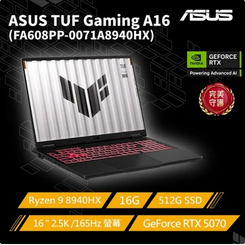 ASUS ROG 華碩TUF Gaming A16 16吋電競筆電灰色(Ryzen 9 8940HX/16G/GeForce RTX5070/512G/W11/FA608PP-0071A8940HX)
