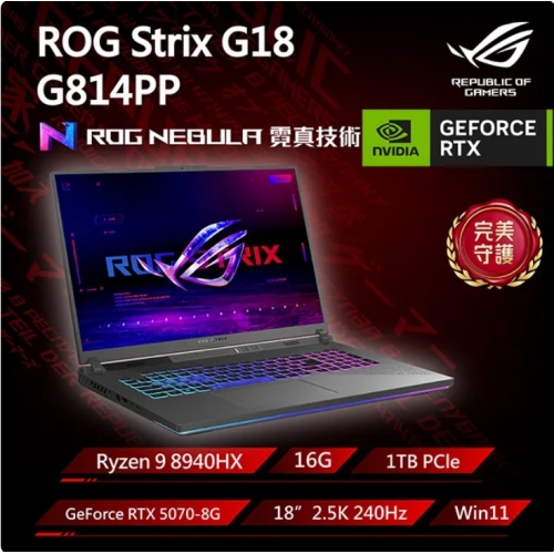 ASUS ROG 華碩Strix G18 18吋電競筆電灰色(Ryzen 9 8940HX/16G/1TB/GeForce RTX 5070/WIN11/G814PP-0034C8940HX-NBL)