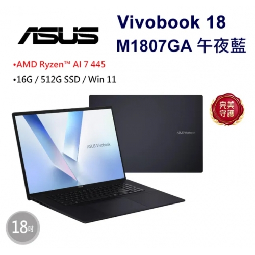 ASUS 華碩Vivobook 18 18吋AI效能筆電藍色(Ryzen AI 7 445/16GB/512G/WIN11/M1807GA-0061B445H)