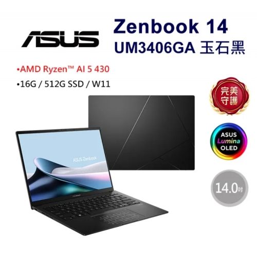 ASUS 華碩Zenbook 14 14吋AI效能OLED筆電黑色(Ryzen AI 5 430/16GB/512G/WIN11/UM3406GA-0042K430H)
