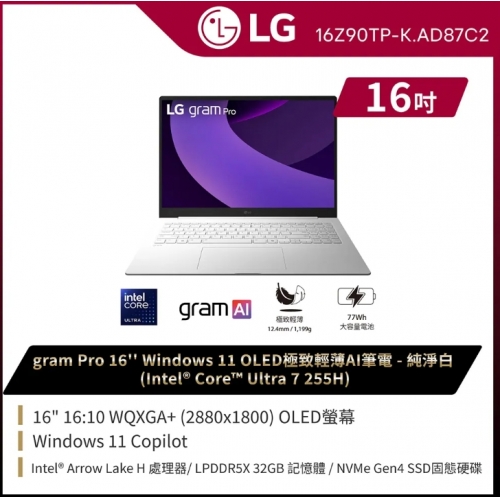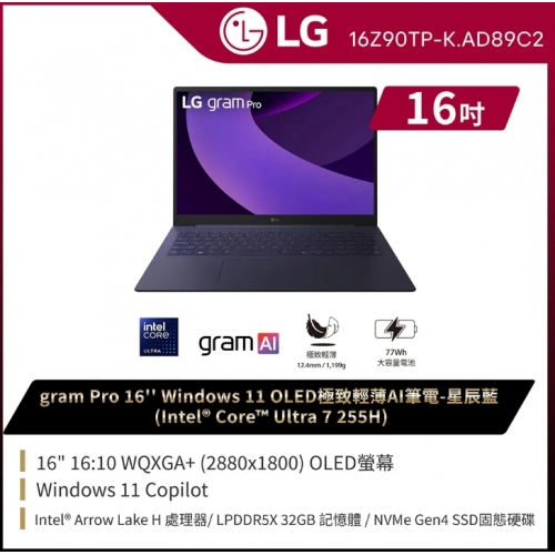 LG 樂金gram Pro 16吋2.8KAI效能筆電 星辰藍(Ultra 7 255H/32G/1TB/Win11/WQXGA+/OLED/16Z90TP-K.AD89C2)