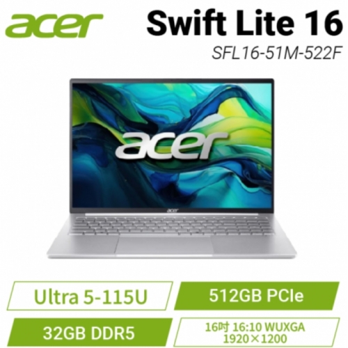 acer Swift Lite SFL16-51M-522F 銀 宏碁時尚輕纖筆電/Ultra 5-115U/32GB DDR5/512GB PCIe/16吋 16:10 FHD+/W11