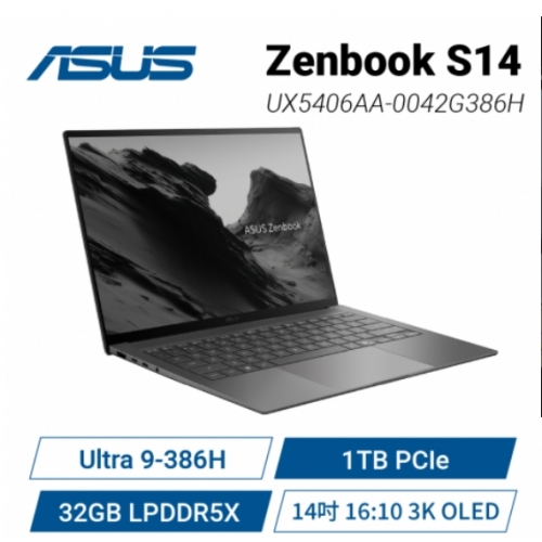 ASUS Zenbook S14 UX5406AA-0042G386H 霧岩灰 華碩時尚極致纖薄筆電/Ultra 9-386H/32GB LPDDR5X/1TB PCIe/14吋 16:10 3K OLED/W11/1.2Kg/含原廠保護袋