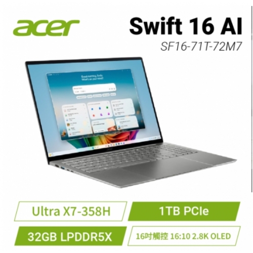 acer Swift 16 AI SF16-71T-72M7 星岩灰 宏碁時尚輕纖觸控筆電/Ultra X7-358H/32GB LPDDR5X/1TB PCIe/16吋觸控 16:10 2.8K OLED/W11