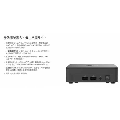 ●主機主要規格 .品牌:ASUS 華碩 .型號:RNUC13ANHI50001 .處理器:Intel® Core™ i5-1340P (12M Cache, up to 4.60 GHz) .記憶體:已加裝非原廠16G DDR4 (經銷3年保固,特仕升級).系統記憶體插槽數:2個 .記憶體最高支援容量:64GB .固態硬碟:已加裝非原廠512G M.2 PCIe SSD(經銷3年保固,特仕升級).傳統硬碟:已加裝非原廠2TB HDD (經銷3年保固,特仕升級).顯示功能類型:內建顯示晶片 .顯示(卡)晶片型號:Intel® Iris® Xe .顯示卡記憶體類型:- .顯示卡記憶體容量:- .作業系統:Windows 11 Pro ●其他規格 .光碟機:無 .讀卡機:無 .電源:120W .有線網路:Intel® i226V 10/100/1000/2500 .無線網路:Intel® Wi-Fi 6E AX211 + Bluetooth 5.3 ●連接介面 ●前端面板 .2 x USB 3.2 Gen 2 .1 x 3.5mm Headset Jack ●後端面板 .1 x USB 2 .1 x USB 3.2 Gen 2 .2 x Thunderbolt 4 .2 x HDMI .1 x RJ45 .1 x DC input ●後面板視訊埠 .HDMI、Thunderbolt ※本商品不含螢幕傳輸線、螢幕轉接頭,請另外購買。 ●機殼規格 .尺寸:117 x 112 x 53mm (LxWxH) .重量:1.64 KG 以上 .鍵鼠組:無 ●注意事項 .原廠保固:台灣3年保固 .保固內容:硬體故障 .此機原廠保固:不包含加裝記憶體、硬碟、顯示卡《由代理商保固》