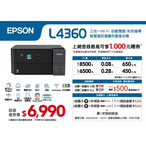 Epson L4360 高速三合一Wi-Fi 自動雙面列印 智慧遙控連續供墨印表機
